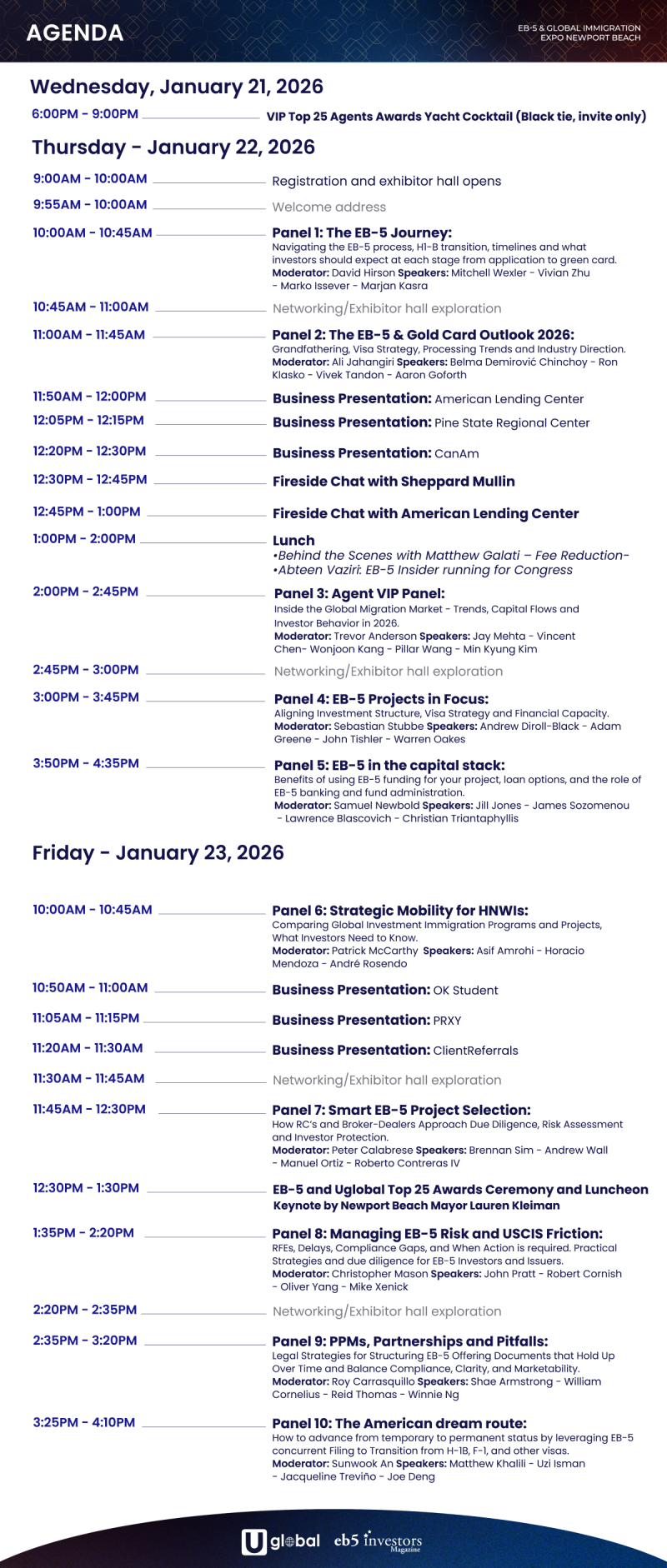 The 2026 Global Immigration Expo in Newport Beach, California will offer high-quality education from industry leaders and is expected to gather global professionals in investment immigration and wealth management. The conference will feature interactive panels moderated by experienced immigration and global migration professionals. The educational panels will cover topics specifically for high net worth individuals, tax and immigration attorneys, migration agents, investors and project developers. The event will also celebrate the distinguished Top 25 winners released in Eb5 Investors Magazine and Uglobal Immigration Magazine.